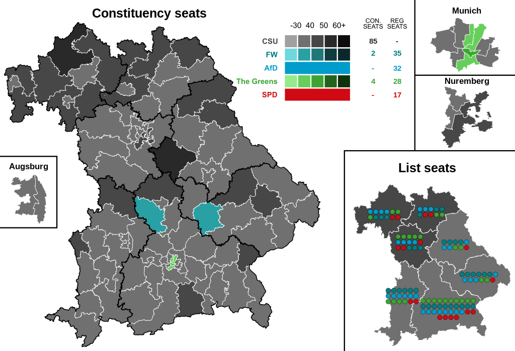 Delstatsvalen i Tyskland i Bayern (13 miljoner invånare) och i Hessen (6,3 miljoner) handlade om delstater med fler invånare än de flesta EU-länderna. De federala koalitionspartierna med SPD (Socialdemokraterna), De Gröna och liberala FDP tappade mark i båda valen. Inget av partierna gick framåt någonstans, utan alla gick tillbaka. FDP klarade inte femprocentspärren i Bayern och åkte ur delstatsparlamentet.